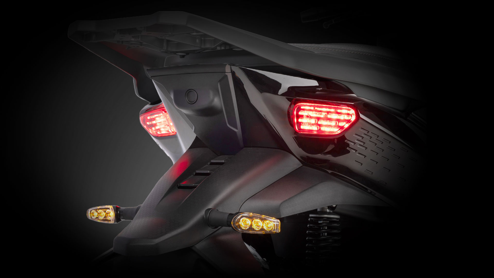 Ο μπροστινός διπλός προβολέας προσφέρει δυνατή δέσμη. Στο επάνω μέρος, η χαρακτηριστική υπογραφή DRL σχηματίζει ένα μπούμερανγκ, τονίζοντας το δυναμικό στυλ του scooter. Τα φλας και τα alarm τοποθετούνται χαμηλότερα στα άκρα της ποδιάς, ώστε κάθε αλλαγή πορείας να γίνεται αμέσως αντιληπτή από τους γύρω.