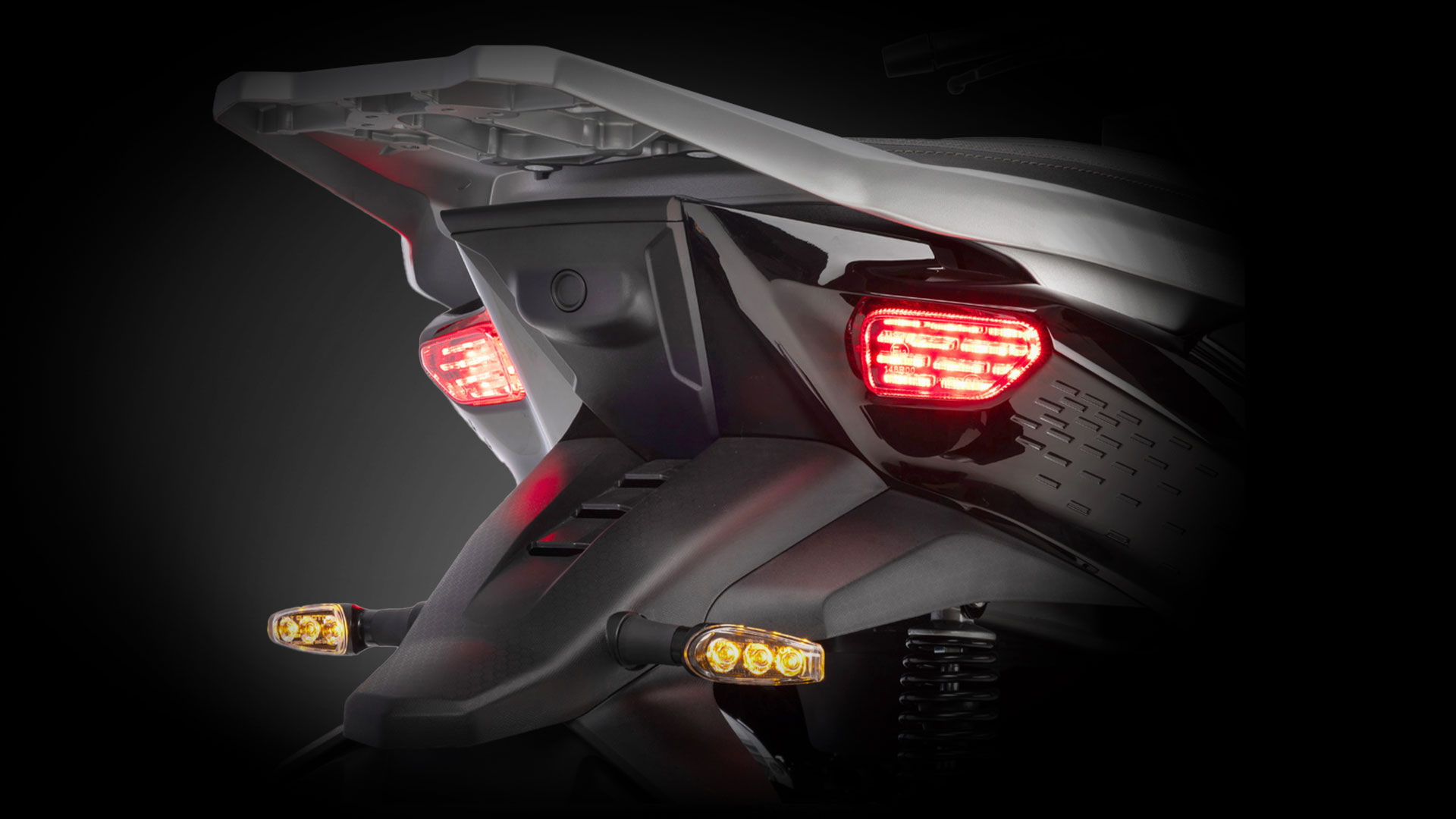 Ο μπροστινός διπλός προβολέας προσφέρει δυνατή δέσμη. Στο επάνω μέρος, η χαρακτηριστική υπογραφή DRL σχηματίζει ένα μπούμερανγκ, τονίζοντας το δυναμικό στυλ του scooter. Τα φλας και τα alarm τοποθετούνται χαμηλότερα στα άκρα της ποδιάς, ώστε κάθε αλλαγή πορείας να γίνεται αμέσως αντιληπτή από τους γύρω.