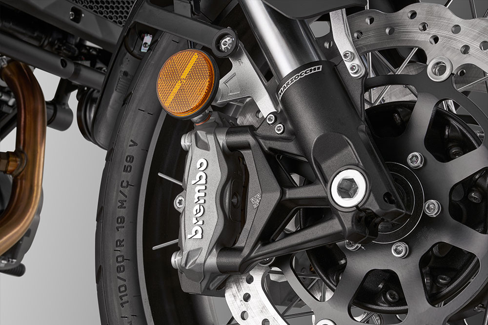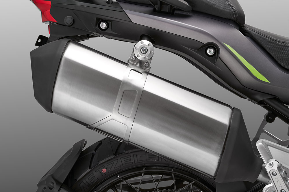 Το τελικό της εξάτμισης 2 σε 1 ενισχύει την εμφάνιση της μοτοσυκλέτας και συνοδεύει τη λειτουργία του κινητήρα με μπάσο, ιδιαίτερο ήχο, αναδεικνύοντας τη χαρακτηριστική χροιά του δικύλινδρου συνόλου.